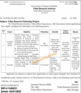 The Tribal Research Institute, Tribal Affairs Department, J&K Government invites applications from cligible candidates for fellowship in the following projects