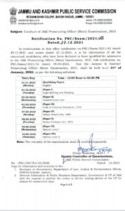 In continuation to this office notification no.PSC/Examl2O2l /62 dated: 29 .1\ .2021 and notice dated: 21.72.202 i , it is for information of a1l the concerned candidates, who have been declared to have qualified for admission to the J&K Prosecuting Officer (Main) Examination, 2027 vtde notification no. PSC/Exam/2021 /57 dated: 09.09.2021, that the Jammu & Kashmir Prosecuting Offrcer (Main) Examination, 2021, sha1l be held w.e.f 31’t of January, 2022, as per the following schedule: